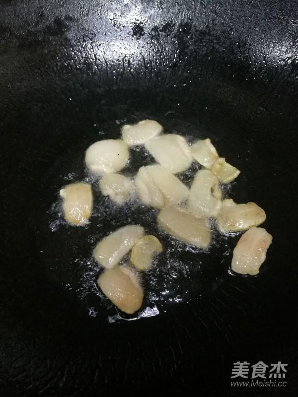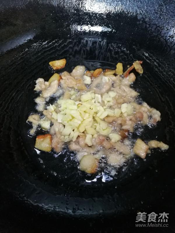 7.下瘦肉炒至變顏色,下蒜蓉炒出香味。