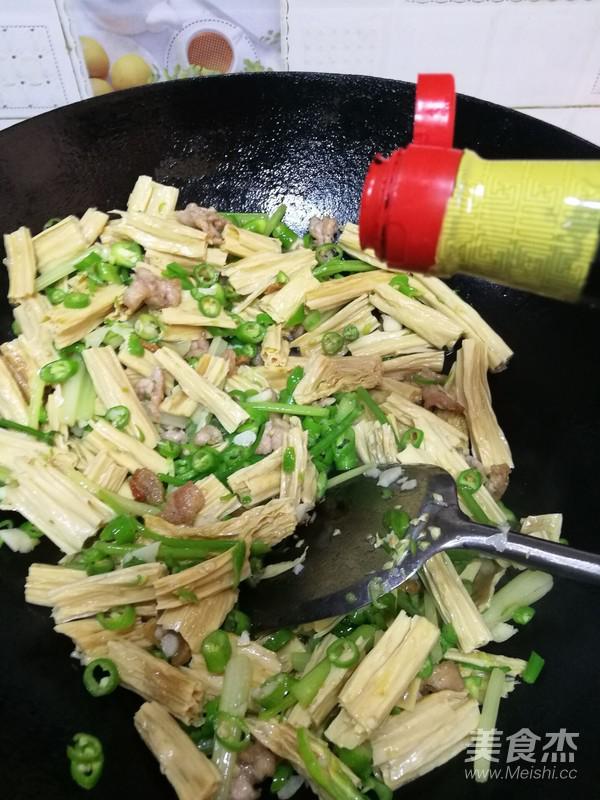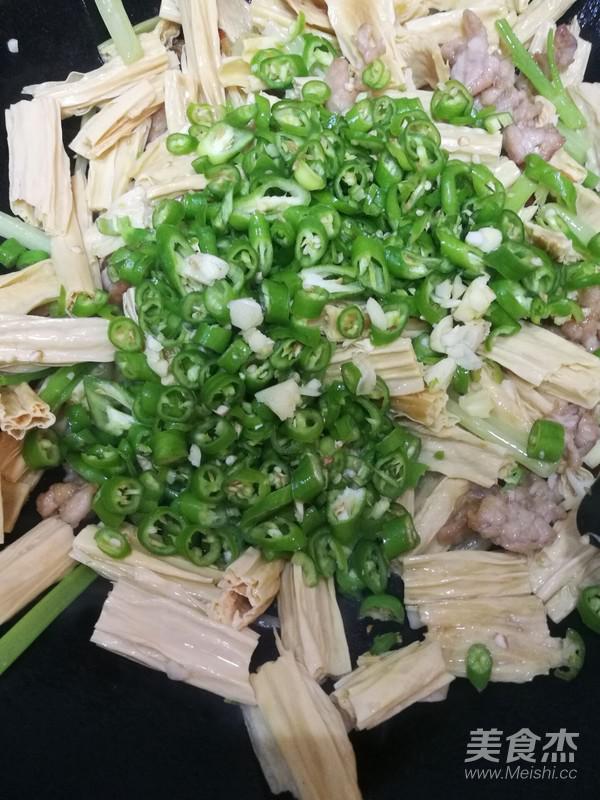 10.腐竹有點(diǎn)變軟的時(shí)候加入青椒碎翻炒。