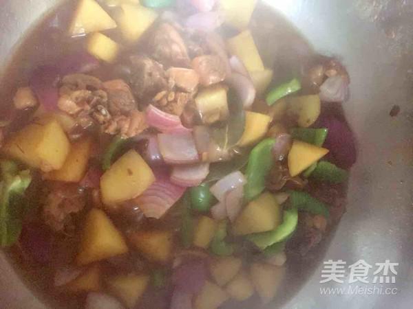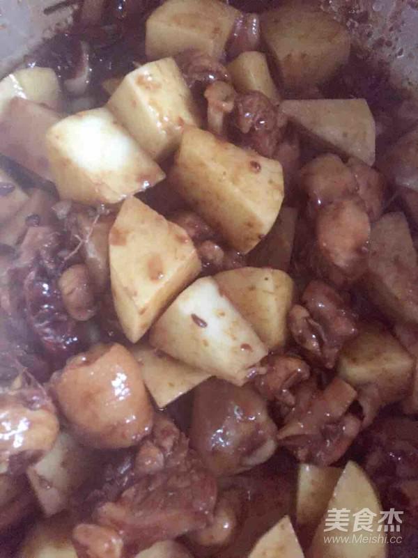 放入土豆繼續翻炒 翻炒均勻后倒一碗水 不要太多 稍微沒過食材就可以。蓋鍋蓋小火燜十分鐘左右