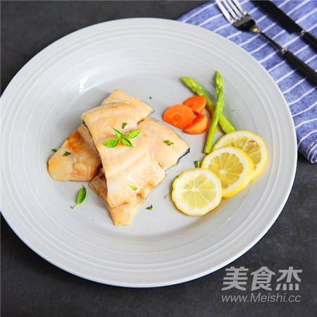 將蘆筍和紅蘿卜焯水后擺盤上,放上沙巴魚、羅勒葉和檸檬片即可。