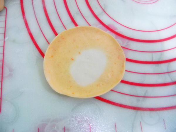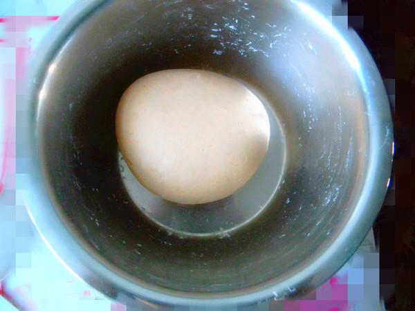 3.用胡蘿卜泥和面,和成軟硬適中的面團,蓋好餳著去做餡