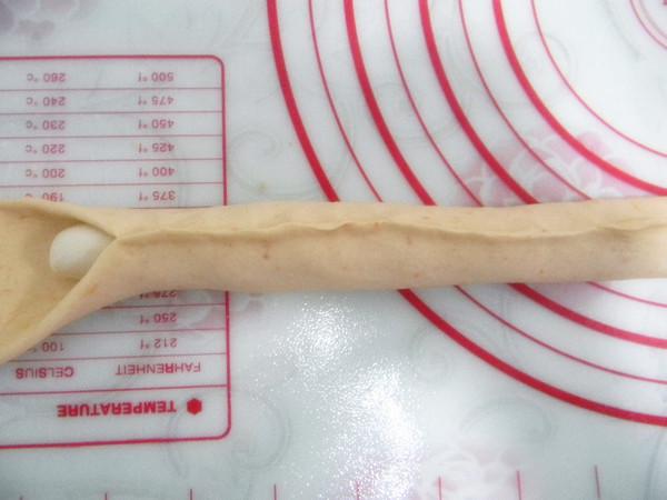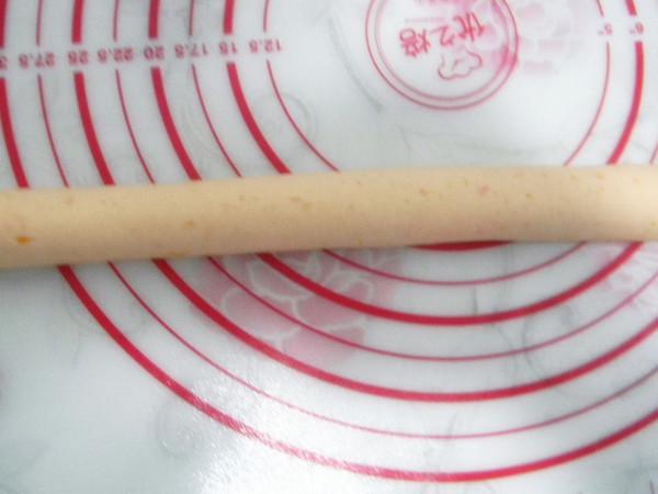 9.取出餳好的面團。白面團搓成細條狀,胡蘿卜面團搓成細條狀后,在搟成片狀,寬度大于白面團的圓柱周長