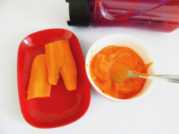 胡蘿卜切片蒸15分鐘,放入料理機加所用胡蘿卜一半分量的水,攪打成泥狀