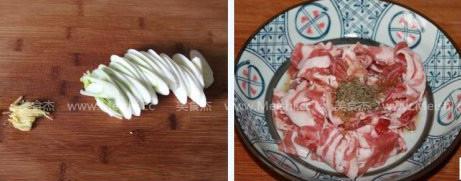 1.蔥白斜著切片,生姜切絲,化凍后的羊肉中放入孜然和料酒