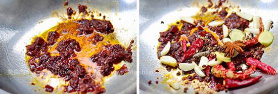 9.加入干辣椒8個、大蒜8瓣、姜4片、八角1個、花椒8粒、麻椒8粒,與豆瓣醬炒香,加入清水