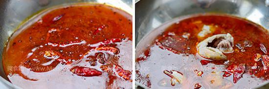 12.鍋中放入植物油,油面微有青煙,油從四周向中間翻動時,放入剩余的干辣椒、花椒和麻椒,用小火炸出香味,辣椒稍變色就關火,將熱油澆在魚片上即可