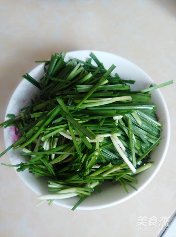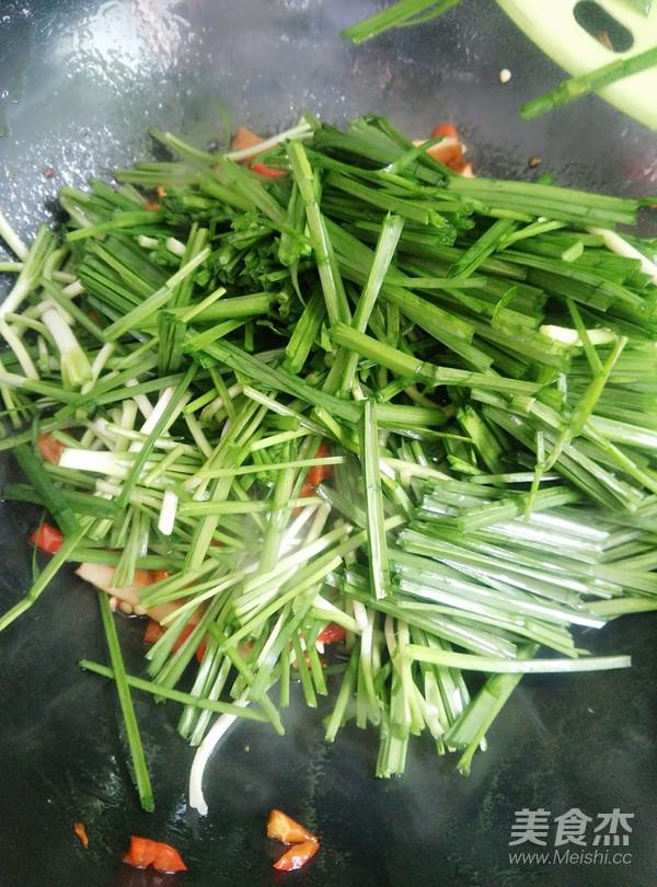 放韭菜炒勻,撒鹽炒至斷生即可出鍋