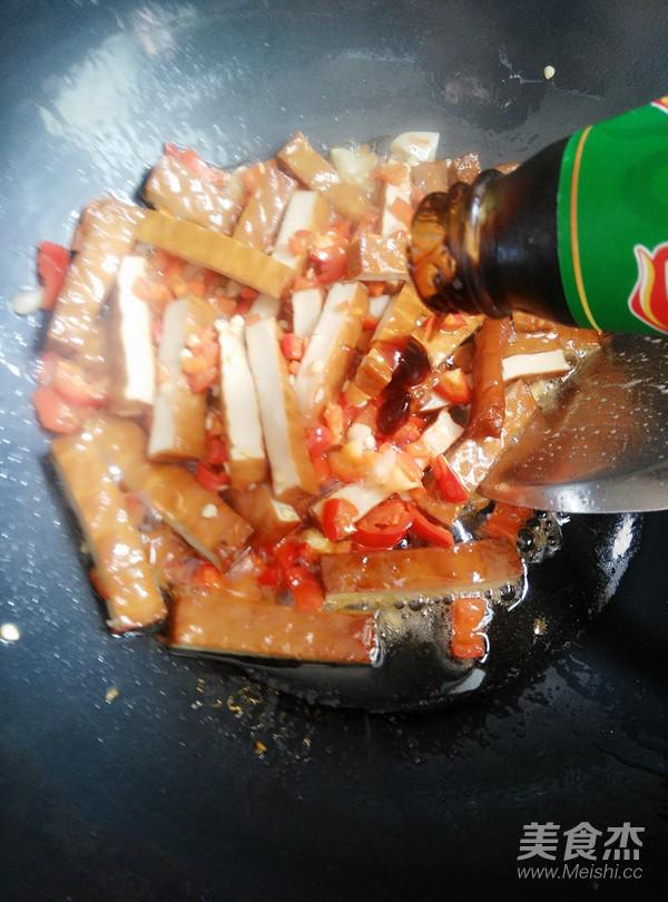 熱鍋倒油,放熏干煎一會,撥至一邊