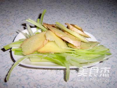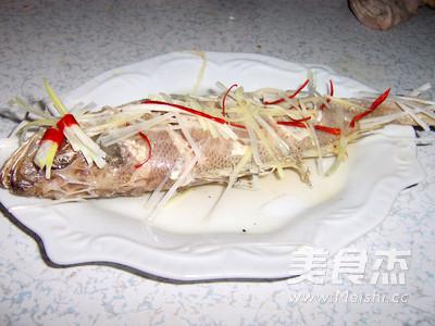 把魚取出倒掉湯汁,去掉姜片和蔥絲。重新在魚身上碼上蔥姜絲,后把熱油潑在魚上