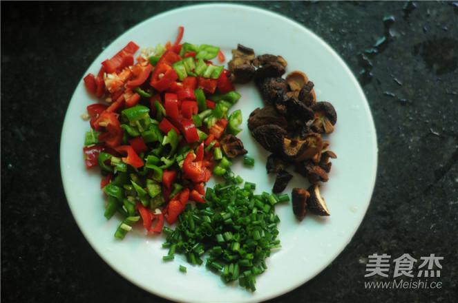 5.青紅椒去籽切丁、泡好的香菇也切成大小一樣的丁、蔥花姜絲切好