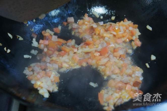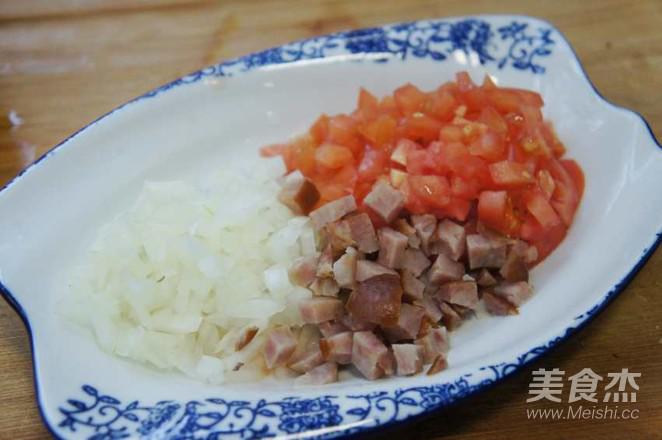 洋蔥、番茄、紅腸去皮洗凈切丁