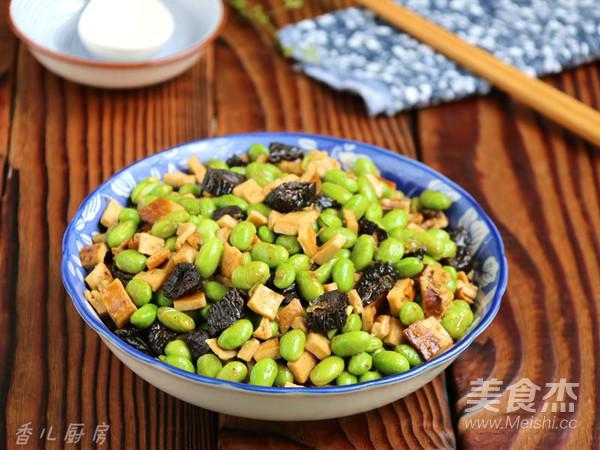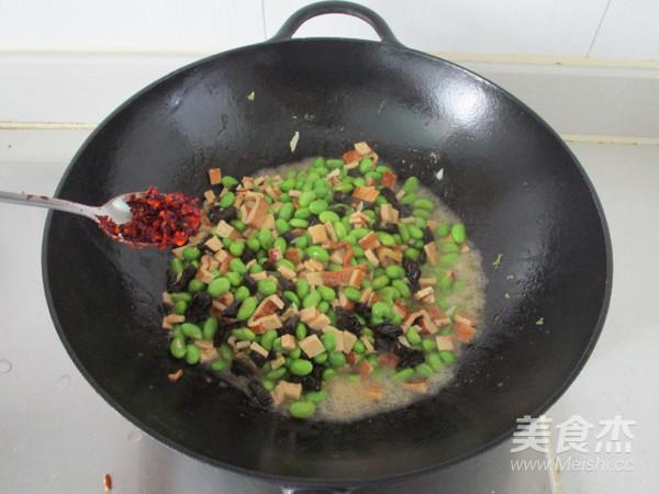 再把香干丁和毛豆子倒入不斷的煸炒至毛豆變色出香味加鹽調味