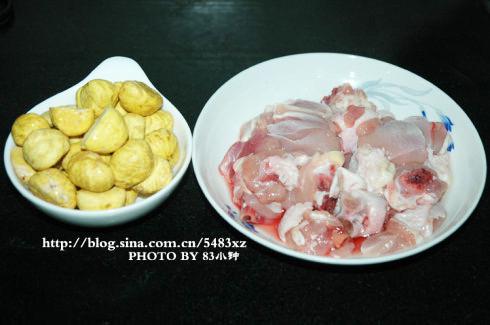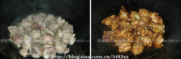 4.雞塊表面微黃后調入料酒,醬油,鹽,少許白糖加入板栗