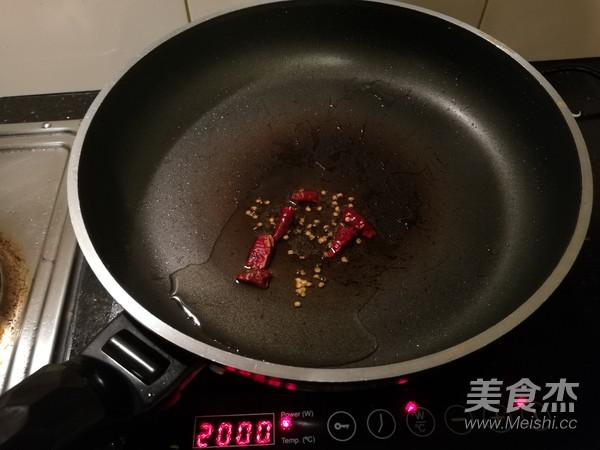 鍋中放適量植物油,并將兩個干辣椒掰開放入,小火慢炸