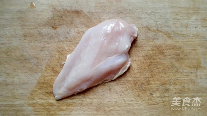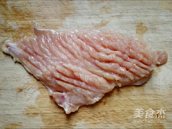 2.將雞胸肉逆紋用刀背稍稍拍松。如果太厚的話,從中間片幾片或者豎著切成幾個約1厘米厚的片也行