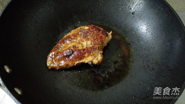 5.兩面都煎好后,把腌制雞胸肉的汁倒入鍋中收汁,撒上黑胡椒碎即可。