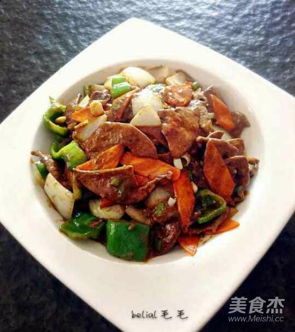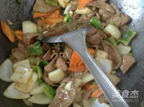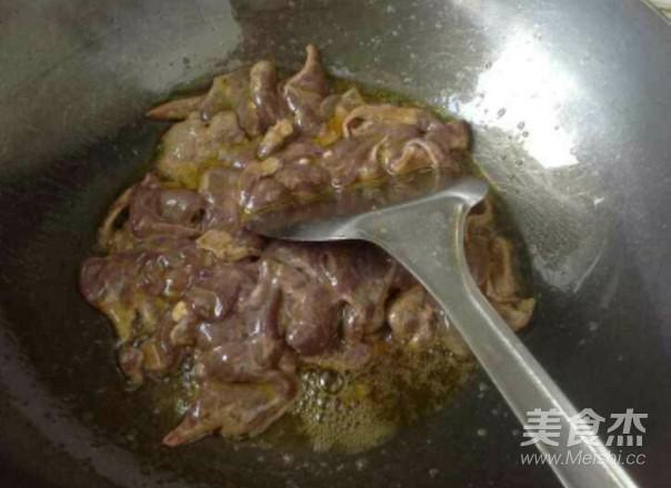 肝炒到8成熟,放入菜翻炒,加入調(diào)味品翻炒,烹點(diǎn)醋,點(diǎn)幾滴香油,加水淀粉勾芡。