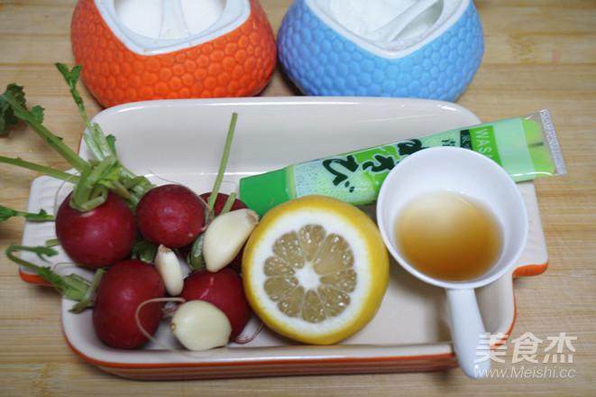 櫻桃蘿卜洗凈切薄片,準(zhǔn)備好需要的調(diào)味料。