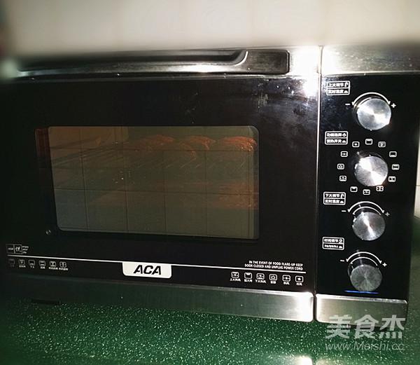 送入預(yù)熱好的烤箱中上層:選擇上管全功率猛火烤功能、溫度220