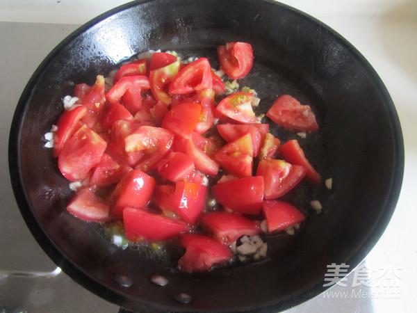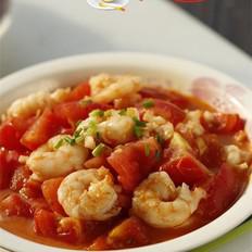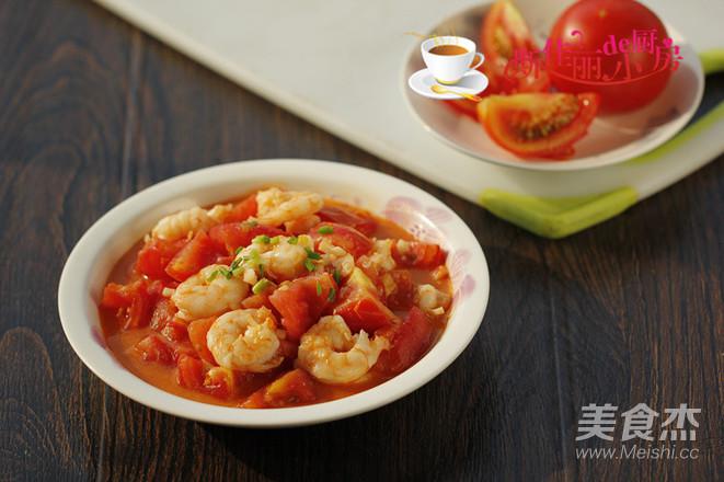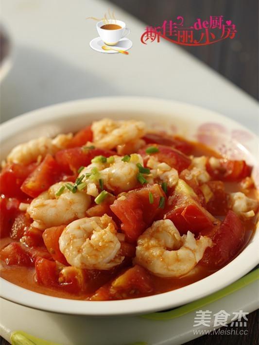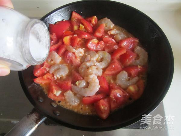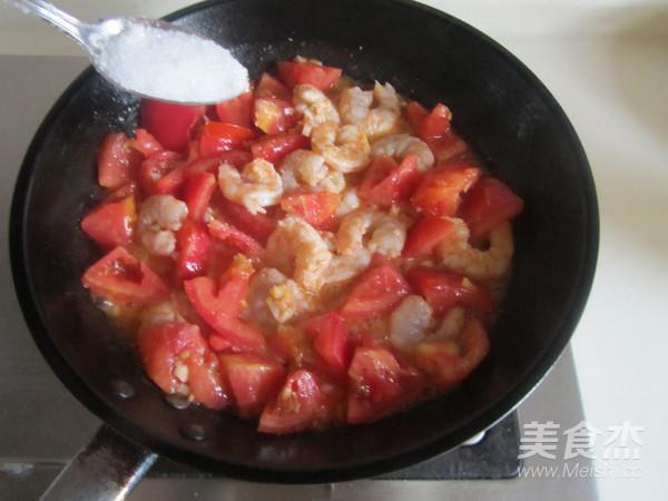 9.番茄塊微微炒出汁來后放入蝦仁進去翻炒;