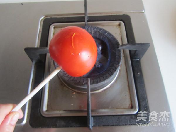 5.用筷子插進番茄中, 放入爐火上烤, 直至番茄皮炸裂;