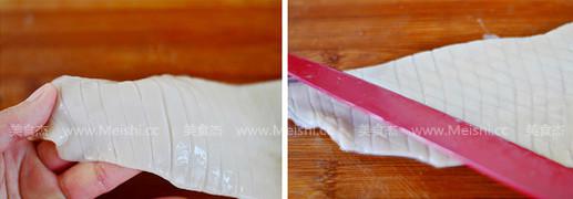 7.但這次記住,第四刀的時候要將魷魚切斷,以此類推,直至整片魷魚切完,然后再切另一半