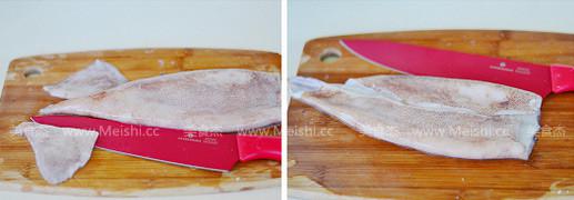2.然后用刀把尾部突出的那塊切下來,再把魷魚從中間切開