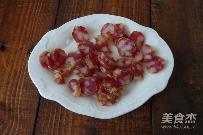 原鍋下小許油,放切片的臘腸,煎至有有點透明