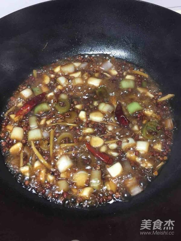 8.1.開火,鍋熱之后放油,依次放入姜絲、蒜、蔥、花椒、紅辣椒等翻炒。