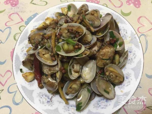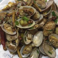 3.待能聞到香味,能看到蔥變軟,放入花甲,香蔥,繼續翻炒,入味盛出。