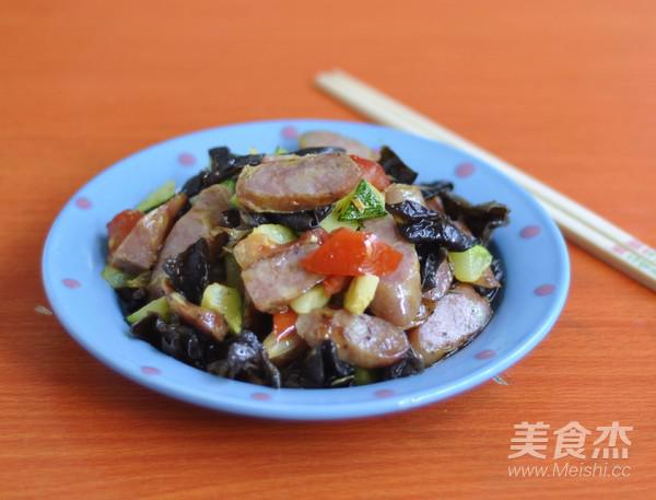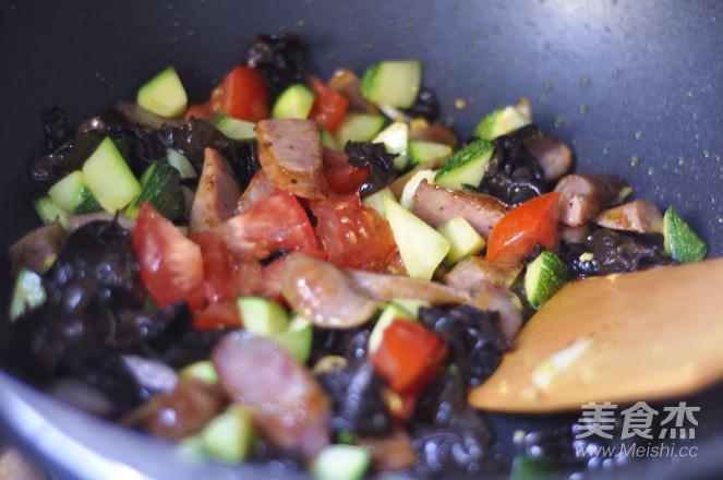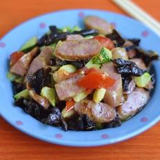 出鍋前,加入準備好的西紅柿做點綴,西葫蘆木耳炒香腸就做好了