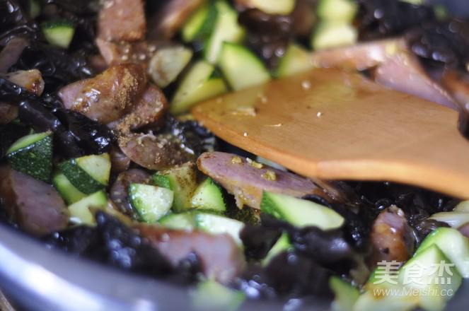 翻炒至西葫蘆表皮變為翠綠色, 加入木耳、鹽、味精、五香粉等