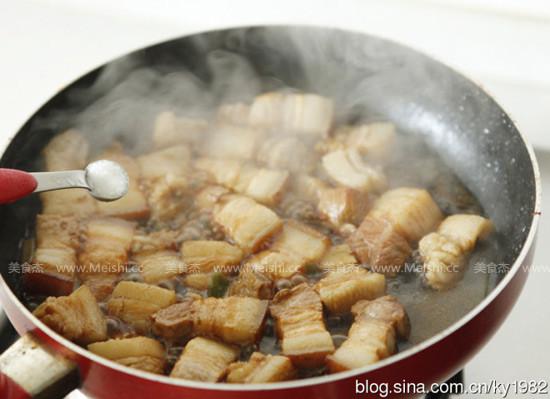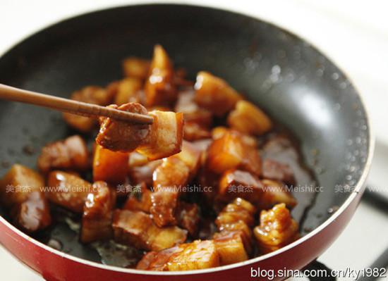 5.馬上把焯好的五花肉放入,迅速翻炒使肉的表面都裹上糖色;然后,倒入料酒、醬油、蔥段和姜片翻炒均勻,加入適量的水沒過五花肉,大火燒開后,轉成小火,蓋上蓋子燉1個小時左右