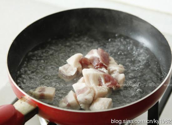 1.五花肉洗凈后切成3厘米見方的塊兒,蔥姜改刀切小