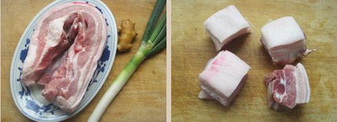 1.將五花肉洗干凈后切成方塊,放入沸水鍋中焯燙5分鐘去除血水,撈出用清水沖洗干凈