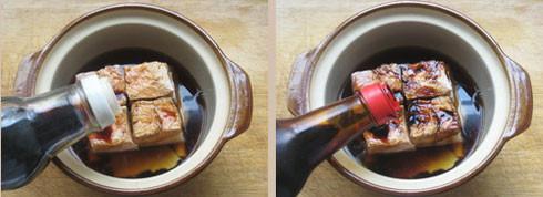 4.將五花肉從砂鍋取出,肉皮朝上放入一個帶蓋的燉盅內,把砂鍋里剩余的湯汁舀入燉盅內,蓋上蓋子入鍋大火蒸20分鐘