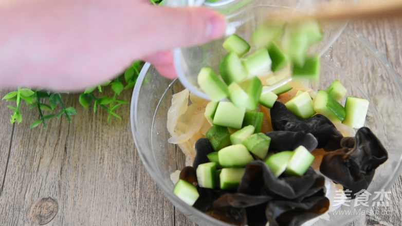 浸泡后的海蜇皮瀝水放入碗中,再倒入黑木耳、黃瓜丁