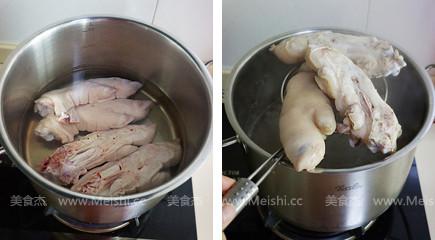 1.將豬蹄一切為二清洗干凈,入鍋中焯水