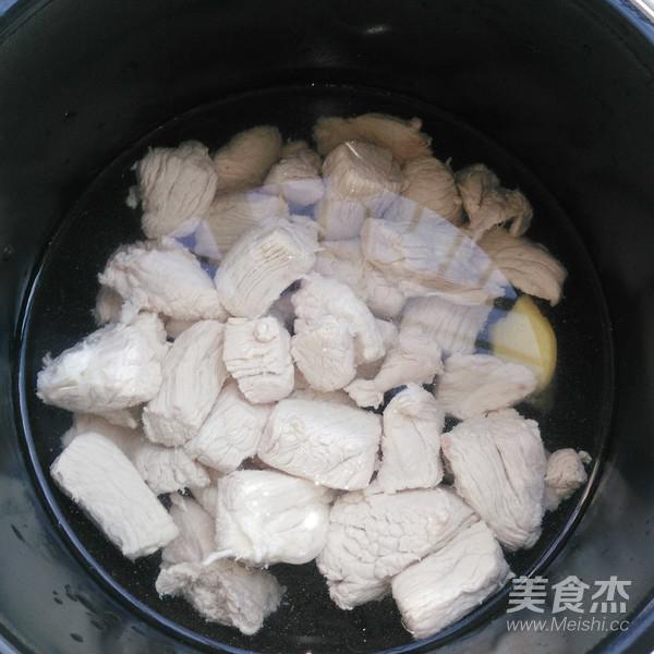 1.瘦肉去筋膜和肥肉,留下純瘦肉750克,洗凈切麻將大小焯水。