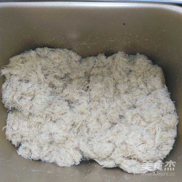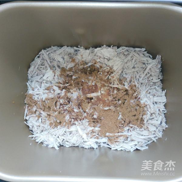 6.放入面包機,加鹽,糖,料酒,鮮貝露,芝麻油,五香粉,生抽,選肉松功能。