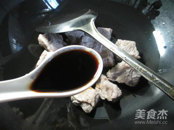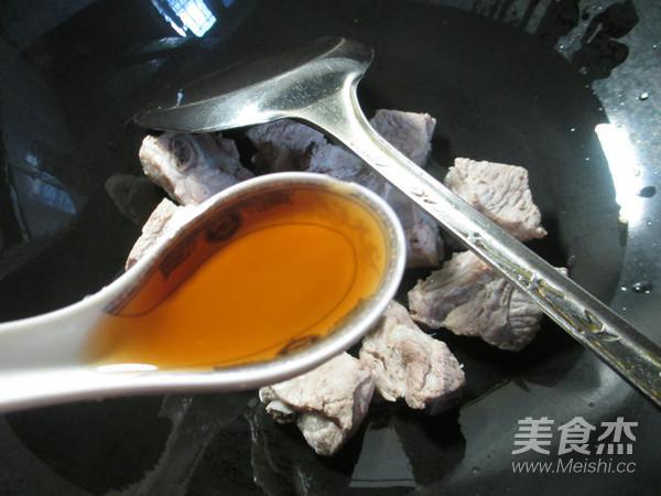 燒鍋加3湯勺油燒熱,下已煮熟的排骨,加1湯勺料酒。