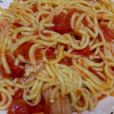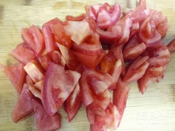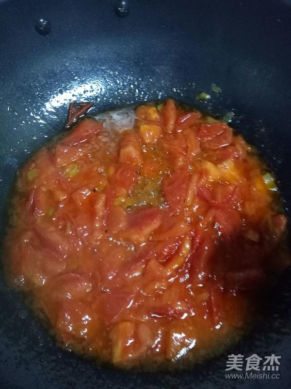 鍋內(nèi)放油適量,將番茄丁倒入,炒到變成泥狀。