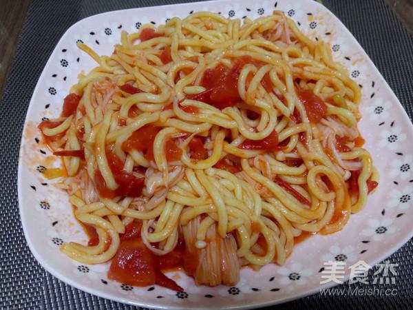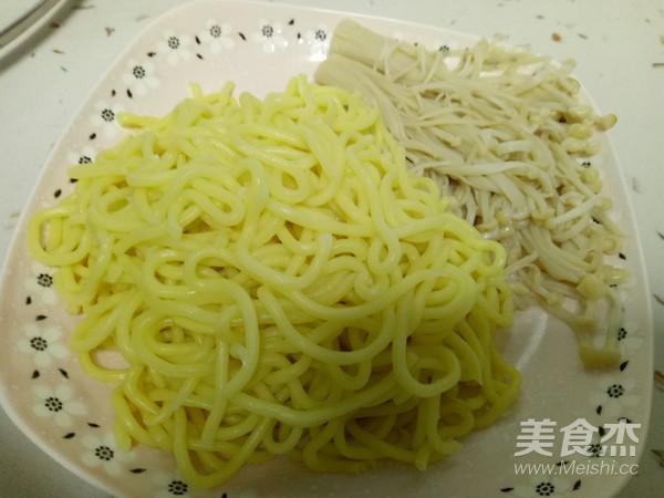 加入拉面及金針菇,翻炒。炒至均勻后出鍋。