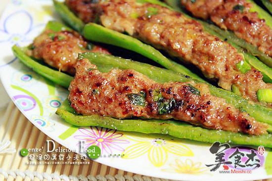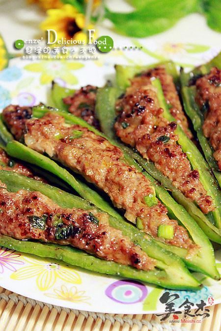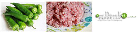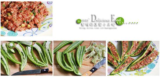 2.尖椒用小刀對(duì)半切開(kāi),去除籽,將適量的肉末釀入