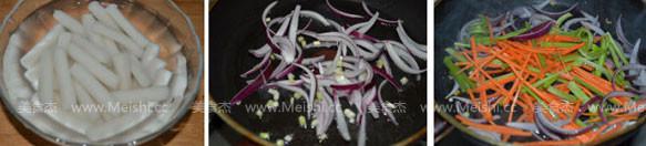 3.煮年糕的時候,可以一邊準備配料,將胡蘿卜、洋蔥切絲、芹菜切段,蔥切花
