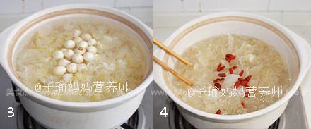 3.砂鍋中倒入大半鍋水,倒入白銀耳和蓮子,大火燒開,轉(zhuǎn)小火慢燉1個小時