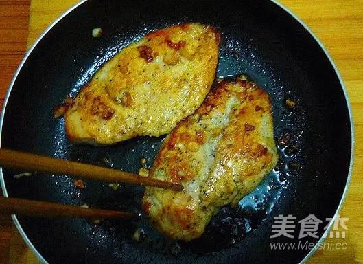 雞胸去筋膜,從中間片開一分為二,分成兩大厚片,撒鹽和黑胡椒碎