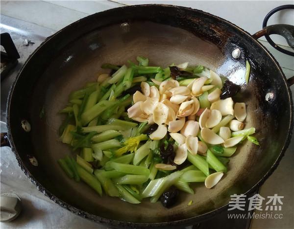 摘去西芹兩邊的筋洗凈,切成較薄的2厘米的斜段。