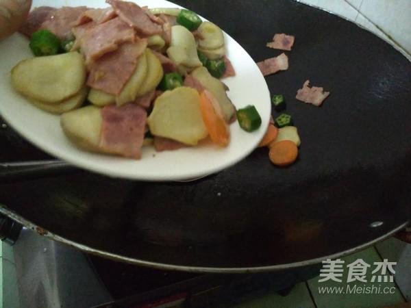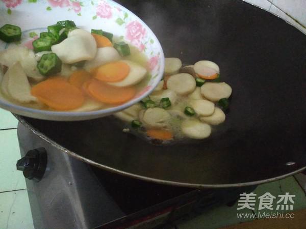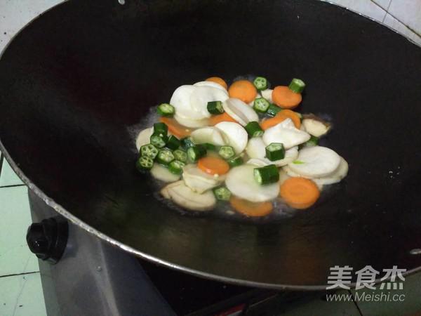 將切好的紅蘿卜、秋葵放入一起炒,加適量的食鹽、白糖,加一點水炒2分鐘