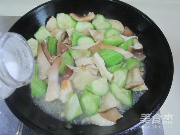 6.煸炒豬肚菇微微發軟時放入絲瓜進去翻炒;